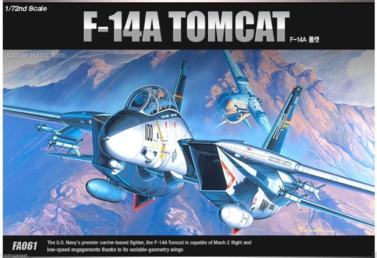 This is a 1/72 Plastic F-14A Tomcat US Navy Swing Wing Fighter from Academy Plastics. It’s for ages 10 and up. Grumman F-14 Tomcat is an American supersonic, twin-engine, two-seat, twin-tail, variable-sweep wing fighter aircraft. The Tomcat was developed for the United States Navy’s Naval Fighter Experimental program after the collapse of the F-111B project.