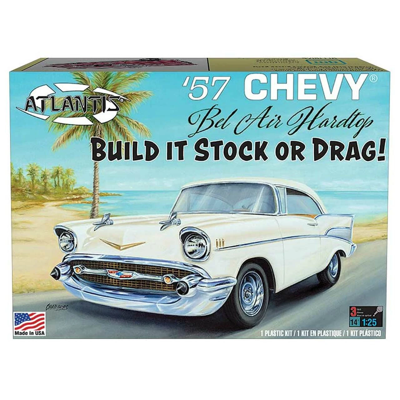 This classic Tri Five Chevy comes molded in white, clear and chrome with updated 1 piece rubber tires and a new decal sheet. Can be built as stock or drag version with Mr. Gasser graphics and logos. Super detailed engine can be built 3 ways: 283 Corvette fuel injection, Six Carburetor and GMC Supercharger. Opening hood, dooors and trunk. Detailed interior with 2 options for the door panels. Officially licensed with General Motors.