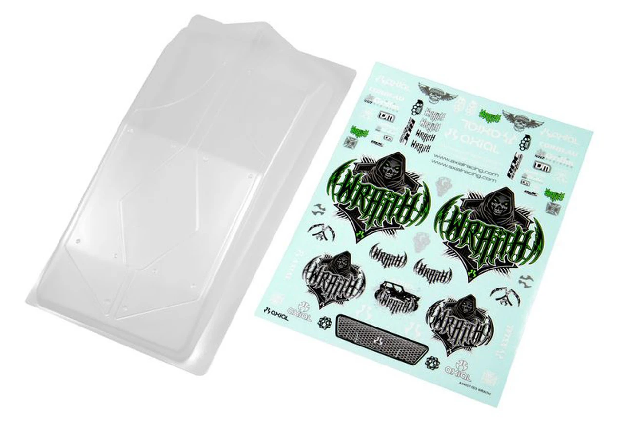 Give your Wraith™ a custom look by painting these clear body panels with your favorite color scheme. Includes left and right body panels, hood and a textured (simulated canvas) roof, all molded in clear .040″ polycarbonate plastic. This set also includes a colorful pre-cut decal sheet featuring official Axial and Wraith™ logos, an aggressive front grille and more!