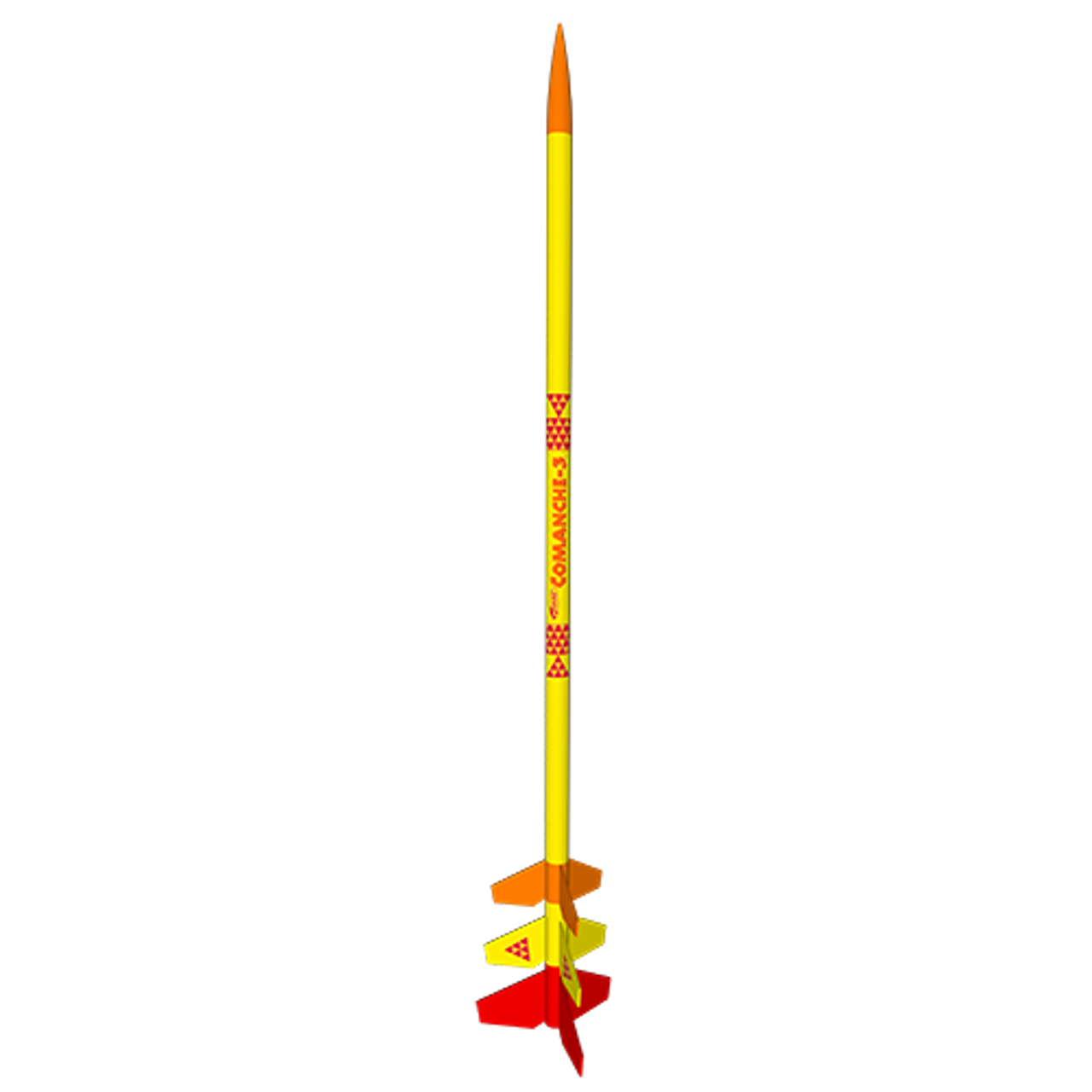 Back by popular demand and a new color scheme! The Comanche-3 has always been a crowd pleaser and this time around is no different! Dual streamer recovery brings this awesome rocket back to earth with tumble recovery for the boosters.