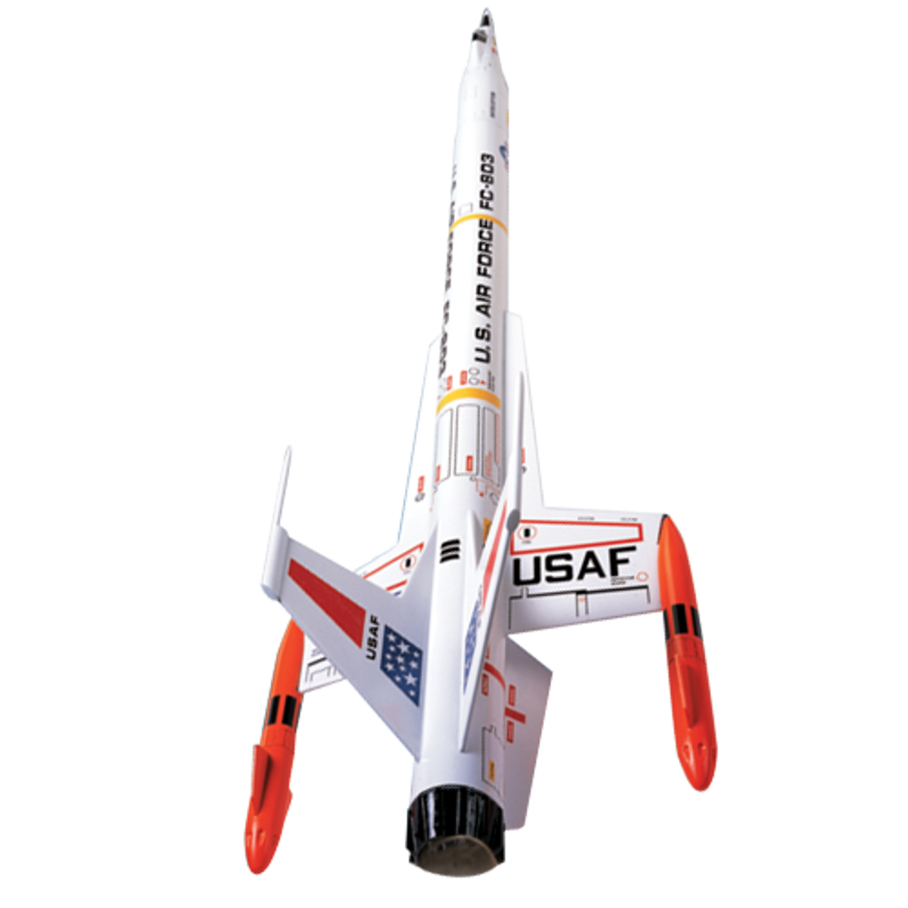 The Estes “Interceptor” is an ultra-sophisticated rocket that could patrol our galaxy for possible aggression by hostile aliens. Highly advanced defense systems, which includes photon and laser armaments as well as ION drive for extended tours around the Milky Way. This kit features laser cut balsa parts, four color water slide decals, detailed plastic nose cone, wing pods and tail cone. When properly outfitted for launch, flights over 500 feet are possible with a soft landing on a colorful 18″ parachute. The futuristic looking Interceptor is sure to be the envy of everyone at the launch site.