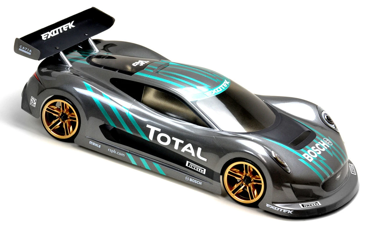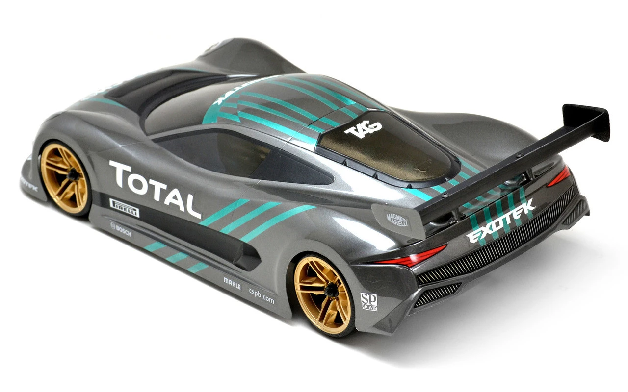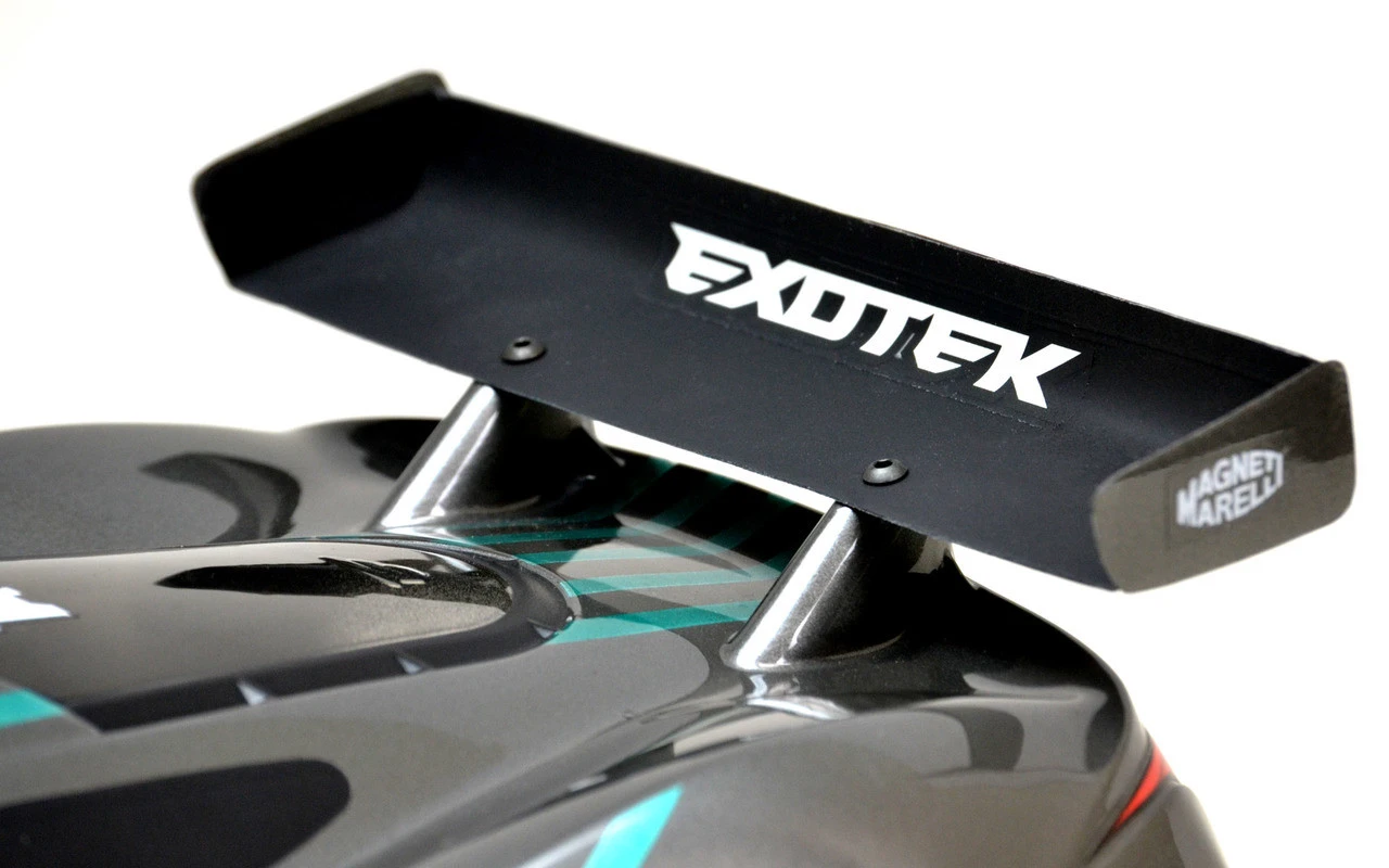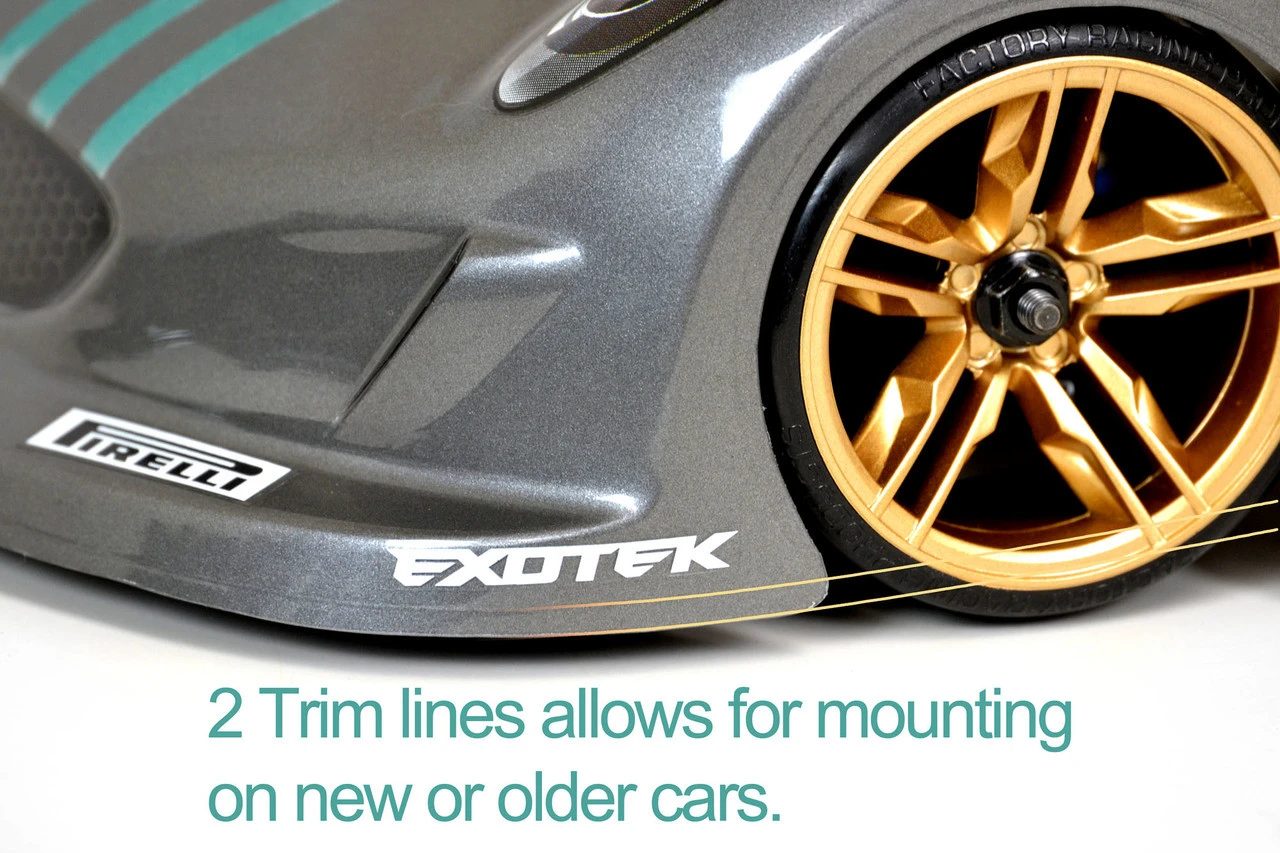 Details such as a large generous proportioned wing provides max downforce while minimizing drag. Designed with ample tire clearance in the wheel wells to mount the body low without rubbing the tires. Specially shaped splitter provides steering while being durable thanks to the modified angles. Raised wing pedestals places the wing higher up into cleaner air. The body is molded from PREMIUM .7mm polycarbonate that is a proprietary only for Exotek and is much stronger and longer lasting than other similar thickness polycarbonate.
