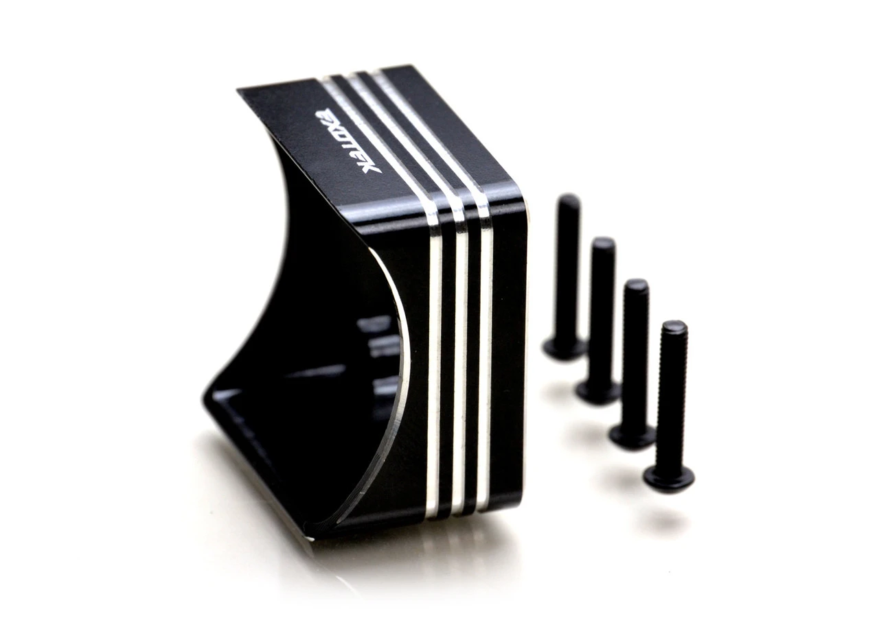 Exoteks Touring Car style 30mm fan shroud blasts your fans air directly onto and through your motors vents for maximum cooling effect. Importantly, the shroud positions the fan about 12mm away from the motor can to help prevent the motor magnets from impeding the fan motor and the shrouds lightweight alloy construction insures factory good looks and extra durable quality. Use the supplied M2.5×16 screws to attach the fan to the shroud and use a small square of R/C sticky tape (3M brand is best) to attach the shroud onto the chassis, right up against the motor. (30mm fan not included.)