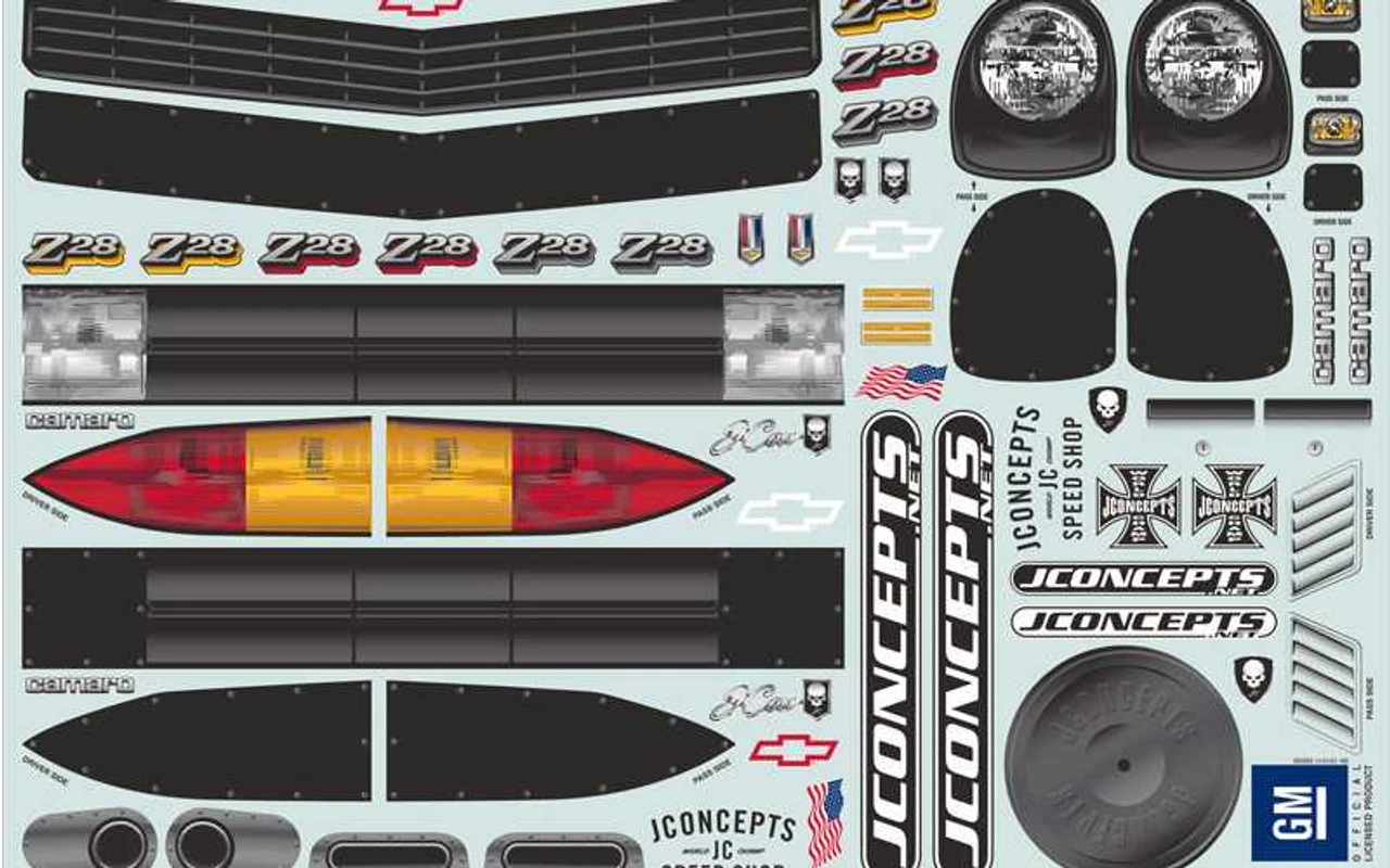 - Decal sheet with Chevrolet, Camaro, Speed Shop and JConcepts badges.