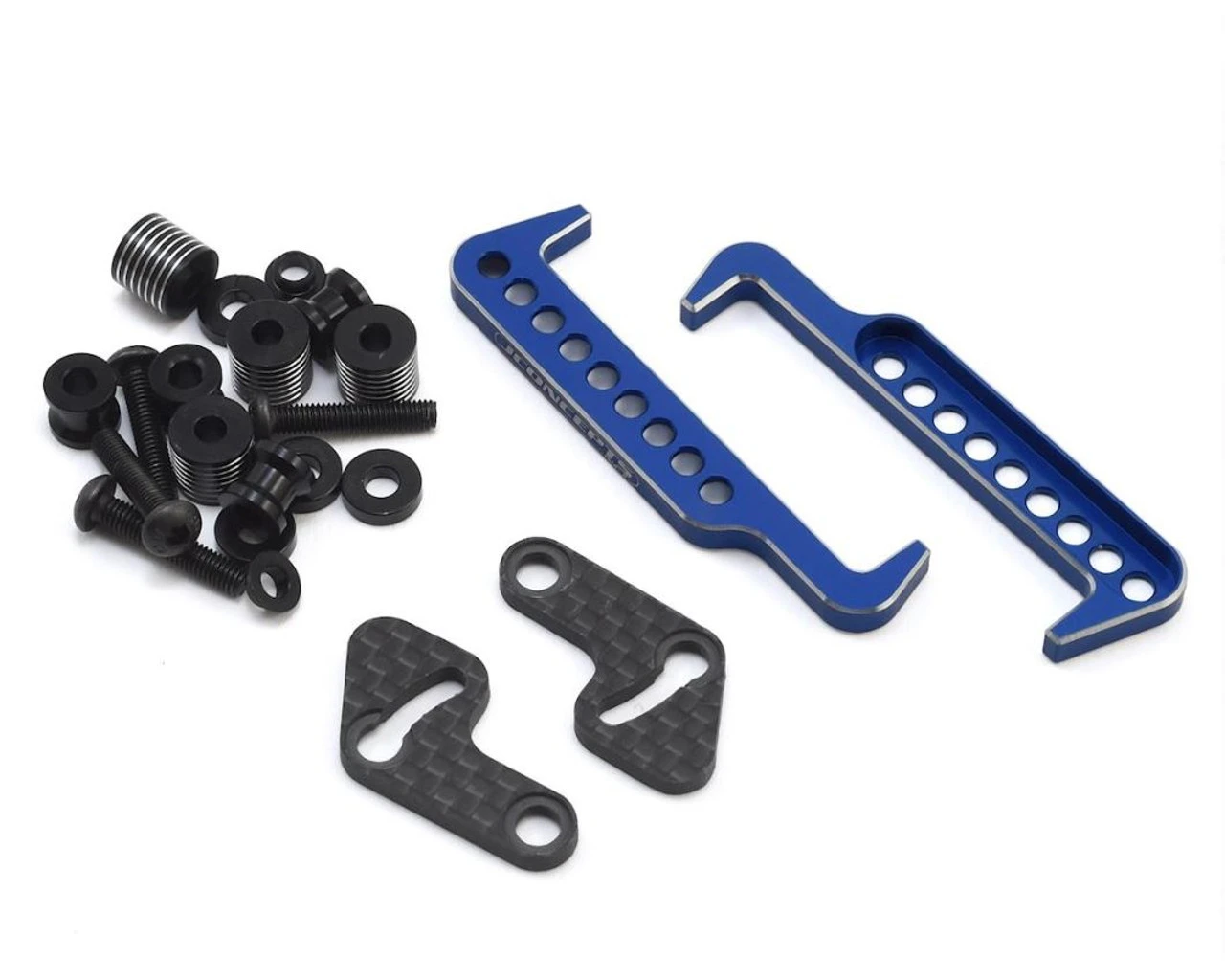 Since there is a lot of variation on the height of the battery packs and what is being used at any given moment, JConcepts has included different spacers to accommodate different heights. When using a tall battery pack, it’s necessary to install the tall stand-offs under the aluminum rails to raise the height of the entire assembly. If more height is needed, install the included 2mm spacers to raise the carbon fiber swings giving the most amount of height.