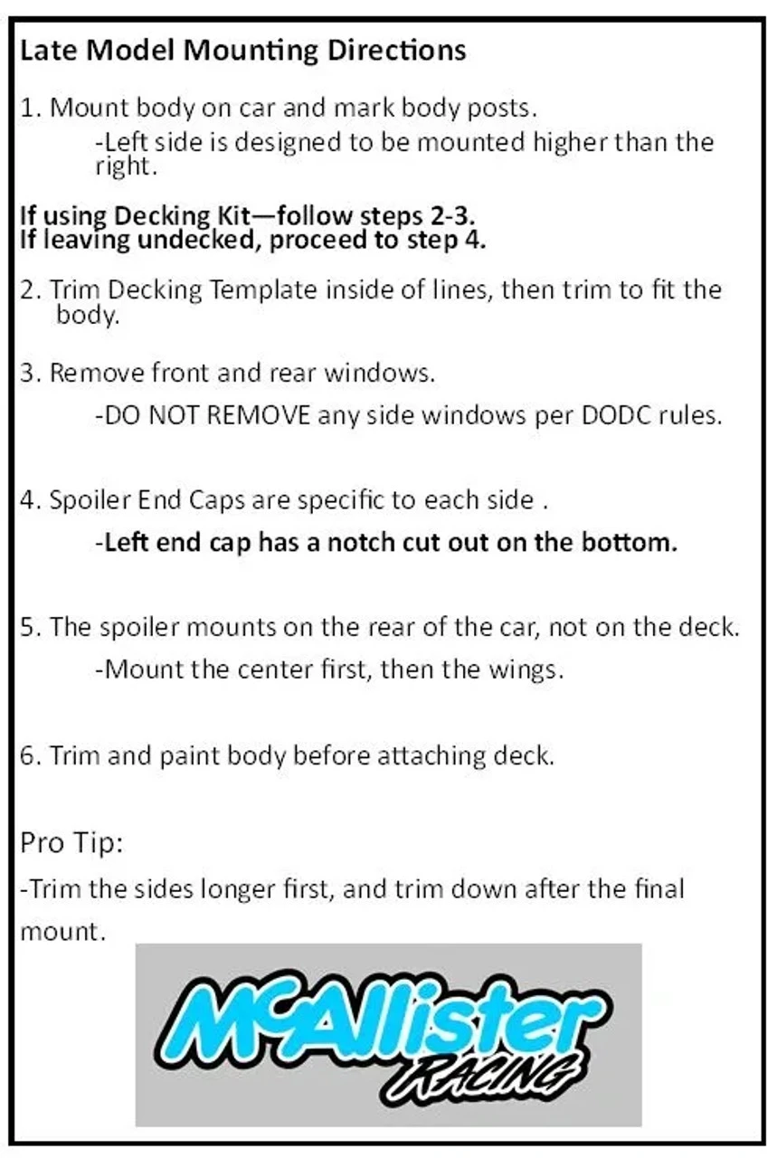 This body utilizes the realistic shapes, curves, and aerodynamic advantages that you will see on the track at top Late Model races across the country. The air travels from the concave nose, to the flat deck, and back to the precut spoiler. This is designed give you the most down force without creating excess drag. The body is pictured with the front and rear windows cut out and the optional decking material installed to give you the most realistic look within DODC rules.