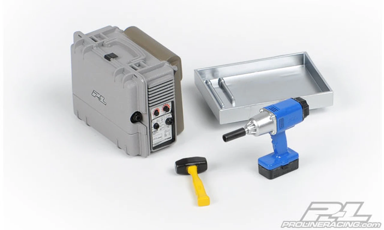 Proline 6073-00 Scale Accessory Assortment #5 for 1:10 Crawlers and Monster Trucks (Portable Welder, Cordless Impact Gun, Sledge Hammer, Tool Box Tray)