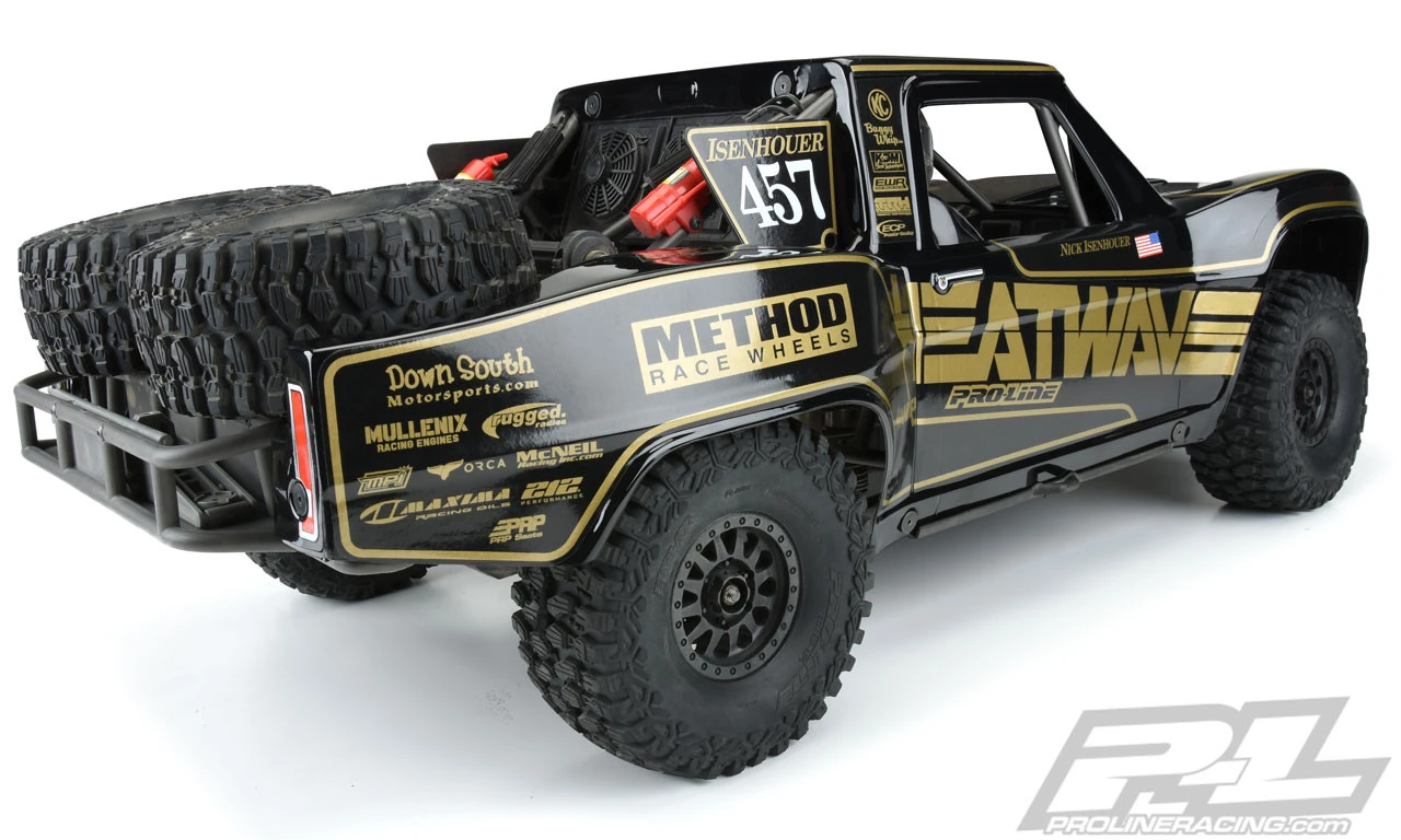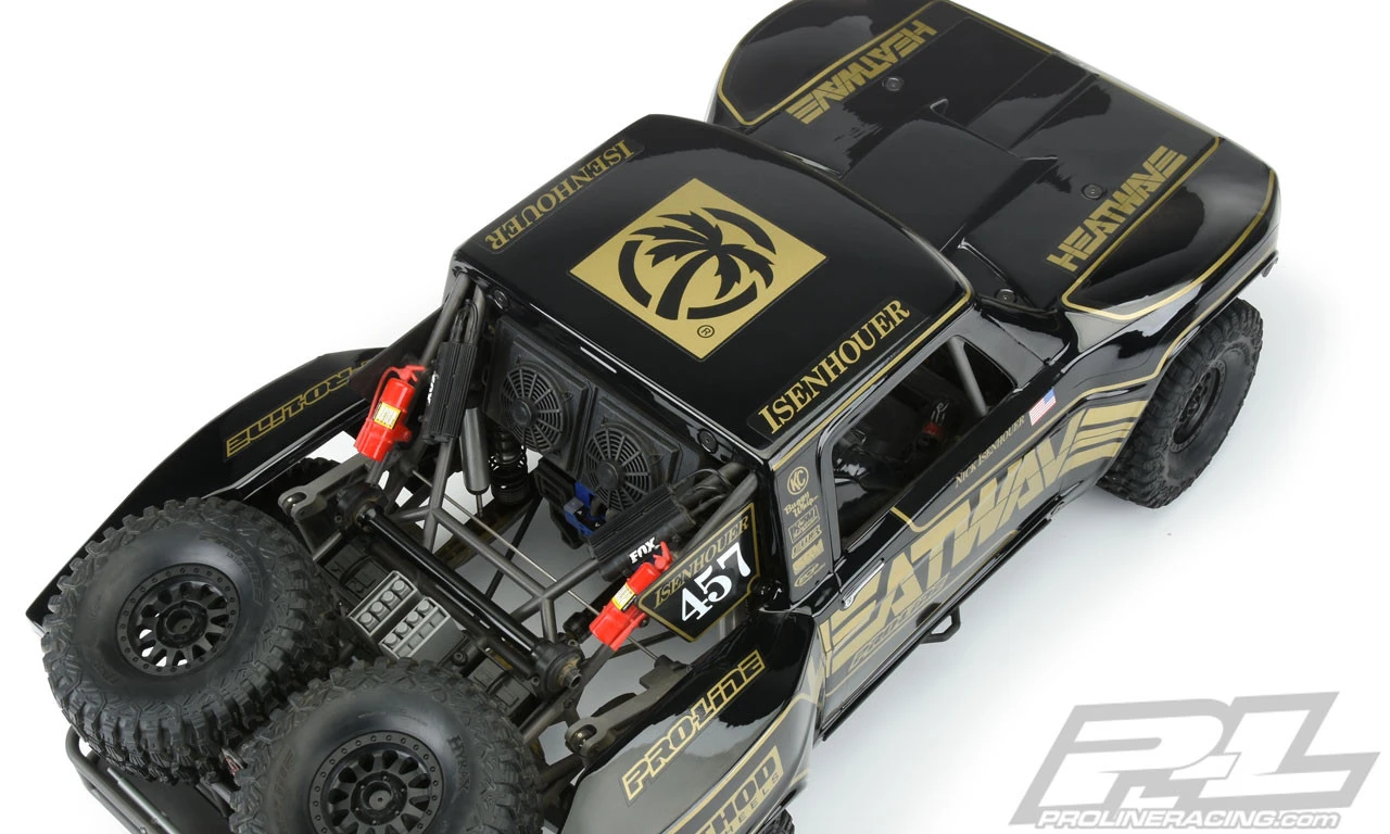 This is a 1967 Ford® F-100 Race Truck Heatwave® Edition Tough-Color (Black) Body for the Unlimited Desert Racer®. Now you can build a fully licensed replica of the popular full-size Heatwave® Trophy Truck driven by Chris Isenhouer! Chris races his iconic Black and Gold Heatwave® Ford® F-100 converted to Trophy Truck specs in the unrelenting desert along with his brother Nick. Pro-Line is proud to bring Chris truck to life for your Traxxas® UDR® made from Pre-Cut Tough-Color Black Polycarbonate. The massive Black and Gold Heatwave® decal wrap is also included and pre-cut for easy installation. The body features the iconic flat front F-100 grill and wide fender flares to represent the aggressive fiberglass bulges found on Chris’s full-size race truck. Pro-Line’s 1967 F-100 Heatwave® Edition body mounts directly to the cage on the UDR® in the same locations as the stock body, so all you need to do is remove the outer film, place the wrap following the included instructions, and install the body just like you would the stock body. Transform the look of your Unlimited Desert Racer® and add even more scale realism with the fully licensed 1967 Ford® F-100 Race Truck Heatwave® Edition Body from Pro-Line!