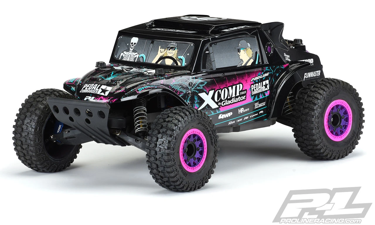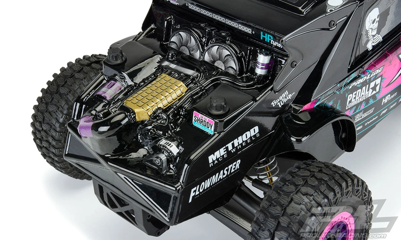 This is a Megalodon Blake Wilkey Edition Desert Buggy Black Body. Pro-Line is proud to collaborate with Shreddy Lyfe’s own Blake Wilkey on a re-creation of The Megalodon: a dune-shredding, wheelie-popping, supercharged V8-powered beast of a buggy! You may remember Blake from the infamous Urban Assault video tearing up the streets of San Diego. Now, you can create your own viral videos by transforming your Slash® 2wd or Slash ® 4×4 with this officially-licensed, super scale body! All the details of Blake’s beast are captured including molded engine details, roof-mounted air scoop, add-on rear fenders, and shark-inspired side wings.