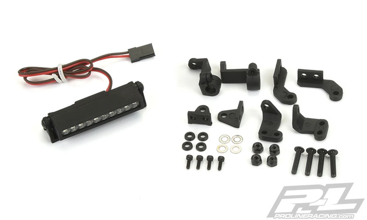 The Pro-Line 2″ Straight Super-Bright LED Light Bar Kit features 10 LED bulbs and has been pre-wired with a 12” long cable that can plug directly into your receiver for power. The Lights are rated for 6V to 12V power, so you also have the option to plug directly into a 3S lipo power source for incredibly bright LED Light!