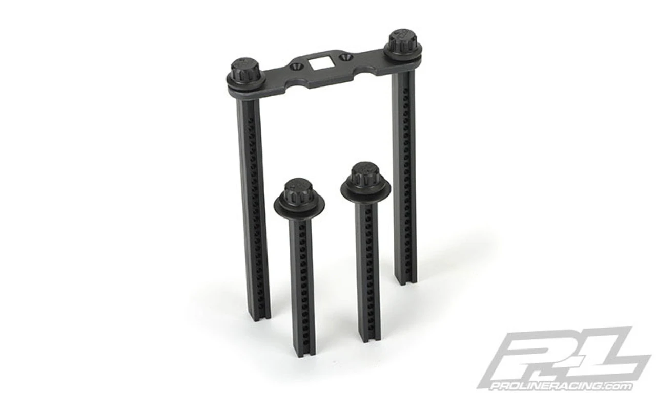 This is an optional Pro-Line Revo/Summit Extended Front & Rear Body Mount set. Pro-Line continues to innovate with more must-have accessories for your Monster Truck. The Pro-Line body mount kit includes adjustable body mounts so you can fit any body on your truck perfectly! But, the Pro-Line Engineers did not stop there. Instead of just using the same old flimsy body clips that always get lost and bent, the Pro-Line Extended Body Mount kit includes a revolutionary screw on body mounting system for a strong and secure mount every time. Just screw down the included setscrew into the body mount, place the O-Ring over the setscrew and mount your body as you normally would. This Extended Body mount kit adds safety, security and styling not available with the stock mounts.