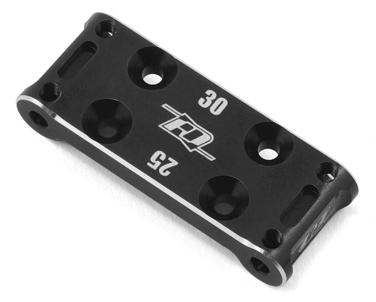 The Revolution Design Racing Products B6 Aluminum Front Bulkhead was designed to replace the standard part with a more sturdy and durable item. The bulkhead comes machined from aircraft-grade 7075-T6 aluminum and its directional design allows to run 25 degree or 30 degree kick-up angle while the anodized surface and silver edge details add visual impact. The aluminum part adds rigidity and precision ideal for racing on high-bite surfaces. The part fits both the B6 and B6D and it is available in black anodizing.