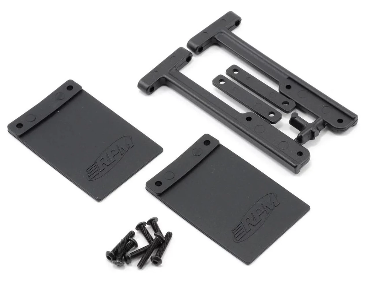 The Traxxas Slash is arguably one of the best and most authentic replicas of a modern Short Course Truck. Unfortunately, it’s lacking in a critical detail than many other manufacturers have incorporated into their trucks, which would be mud flaps. That is no longer an issue! RPM now has a mud flap system that integrates with our new Rear Bumper for the Traxxas Slash (RPM #81002, #81003 & #81005). The RPM Mud Flap System uses a pair of molded nylon support arms that bolt to pre-existing holes in the RPM bumper supports of our Slash rear bumpers. These support arms hold a set of well-designed rubber mud flaps that incorporate the molded RPM Logo on one side and are blank on the other. The end user can decide which side they would prefer to show. One final touch is a pair of molded screw supports that help prevent the screws from pulling through the soft rubber of the mud flaps.