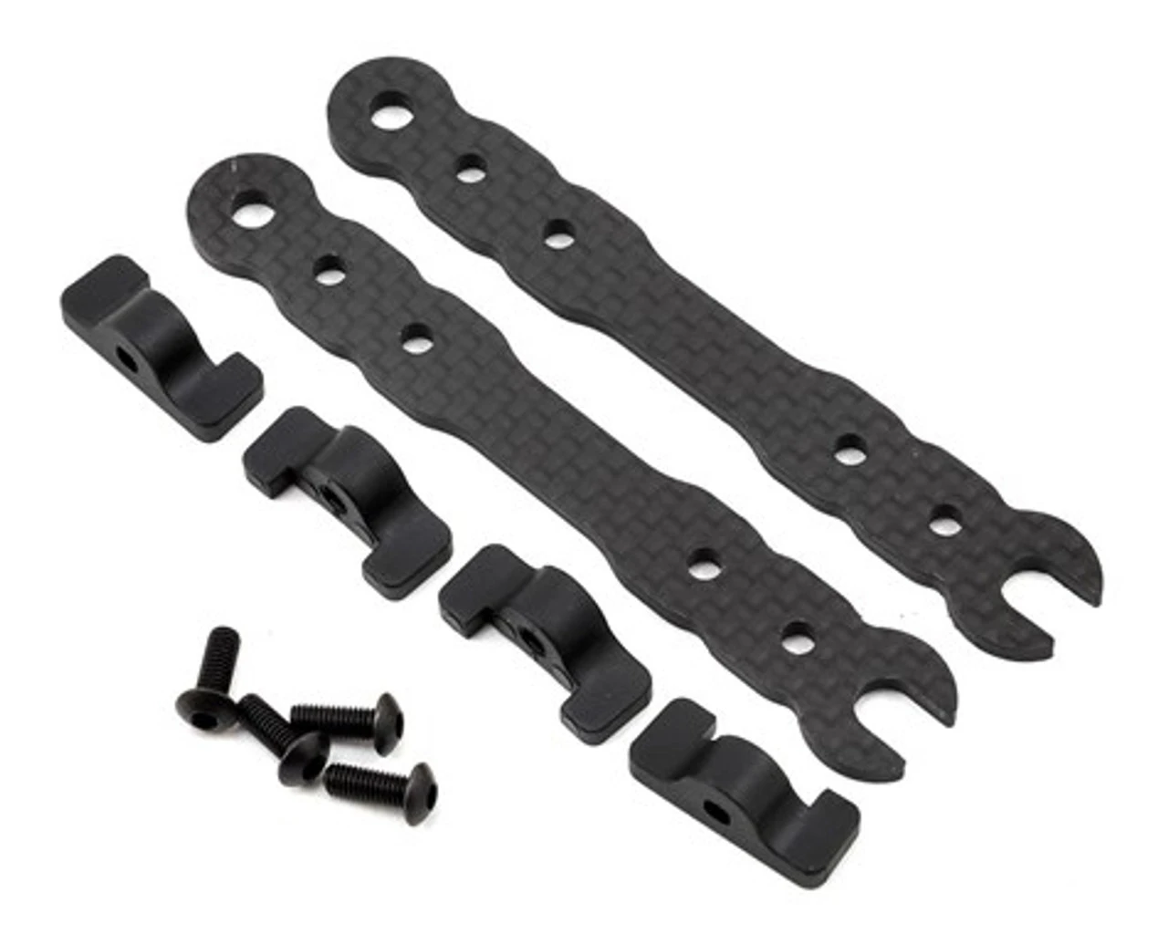 Schumacher’s Cat K2 Carbon Fiber Vari LiPo Strap Set offers three optional battery positions that will allow you to tune the weight balance of your car for different track conditions.