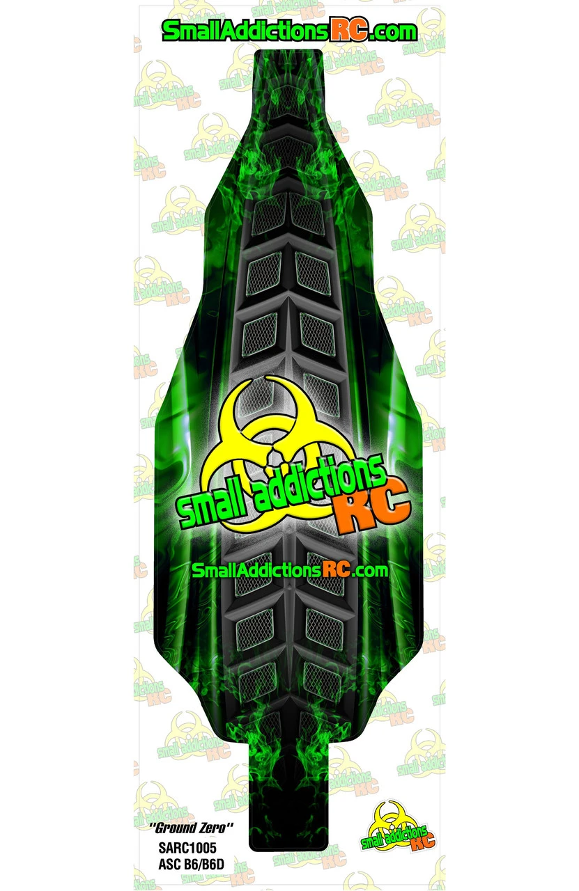 This is a Small Addictions RC 1005 “Ground Zero” (Team Associated B6/B6D) Pre-cut Chassis Protective Sheet. Printed and laminated with high grade automotive film, this quality item is now available to you to protect against friction and dirt. The durable and low-resistance material fits the chassis like a glove while giving you the assurance your chassis is well cared for with the flair you desire in one easy package.