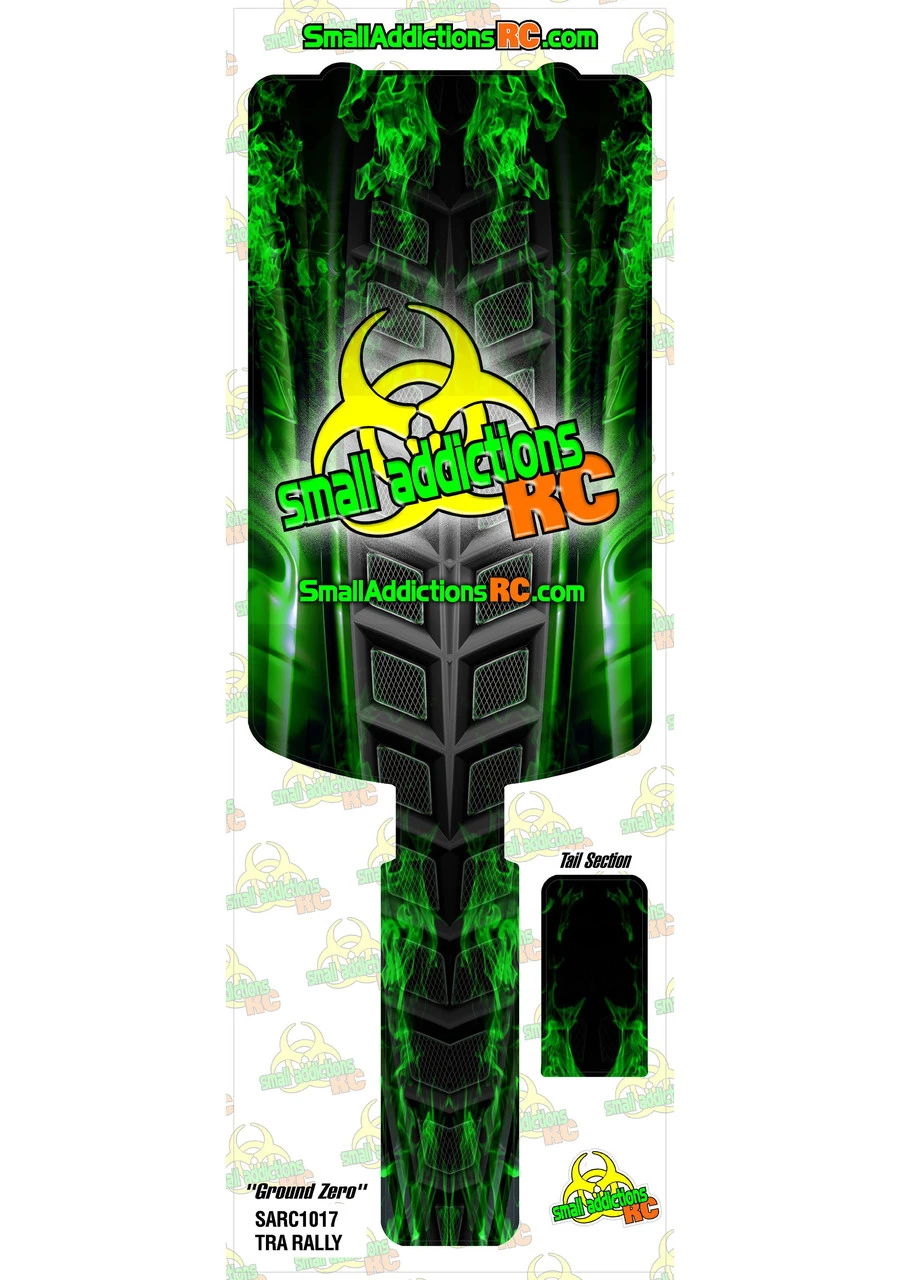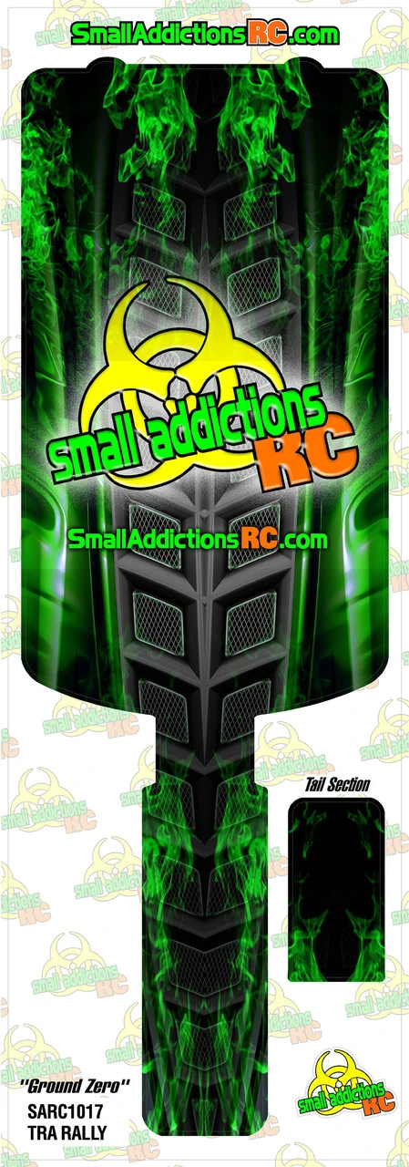 This is a Small Addictions RC 1017 “Ground Zero” (Traxxas Rally) Pre-cut Chassis Protective Sheet. Printed and laminated with high grade automotive film, this quality item is now available to you to protect against friction and dirt. The durable and low-resistance material fits the chassis like a glove while giving you the assurance your chassis is well cared for with the flair you desire in one easy package.