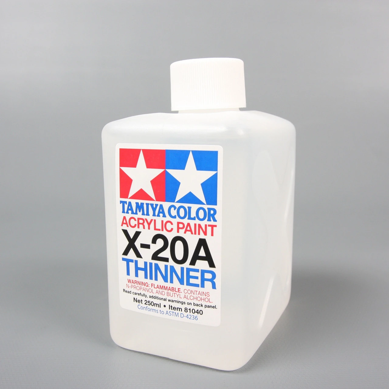 Tamiya X-20A acrylic thinner is the perfect choice to thin Tamiya acrylic paint when spraying through an airbrush or cleaning bristle brushes. The formula within the thinner gives Tamiya acrylic paints the right consistency to blend colors without fading or spotting. This bottle is 250ml in size.