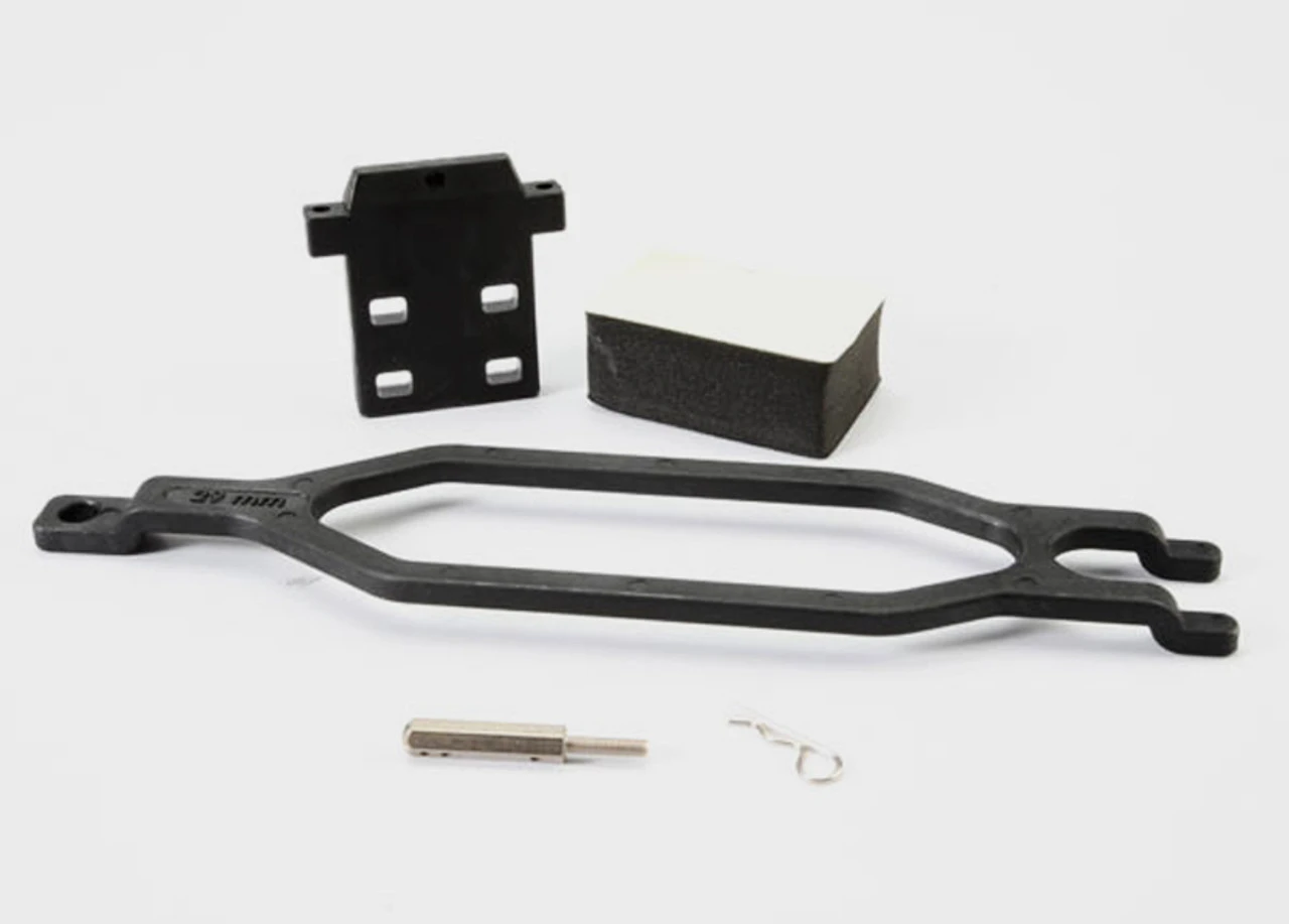 This extended battery hold down for the Slash 2WD (standard or LCG) or Slash 4×4 (standard only) allows for LiPo packs of up to 42mm tall to fit in the stock battery tray. Package includes the battery strap, battery strap retainer, battery post, foam spacer and an angled body clip.