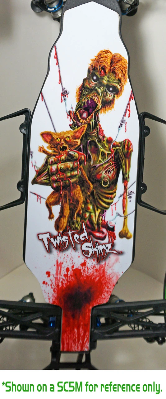 Straight from the twisted mind of internationally renowned horror artist: George Silliman designed this authentic Twisted Skinz 1213 “Hooked” (TLR 22T) Pre-cut Chassis Protective Sheet. Printed and laminated with high grade automotive film, this quality item is now available to you Zombie/Horror Freaks to protect against friction, dirt, and the living dead. The durable and low-resistance material fits the chassis like a glove, while giving you the assurance your chassis is well cared for, with the demonic flair you crave all in one easy package.
