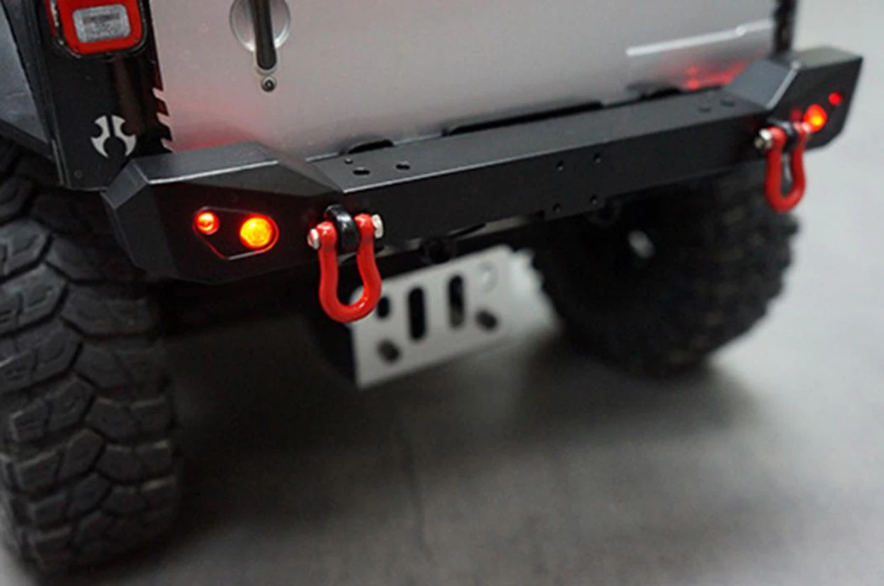 Each bumper features four LED mounting points. For the front bumper, four white colored LED’s are included. For the rear bumper, four red LED’s are included. Also included in the package are four red shackles and mounting hardware, with two shackles to be installed on each bumper.