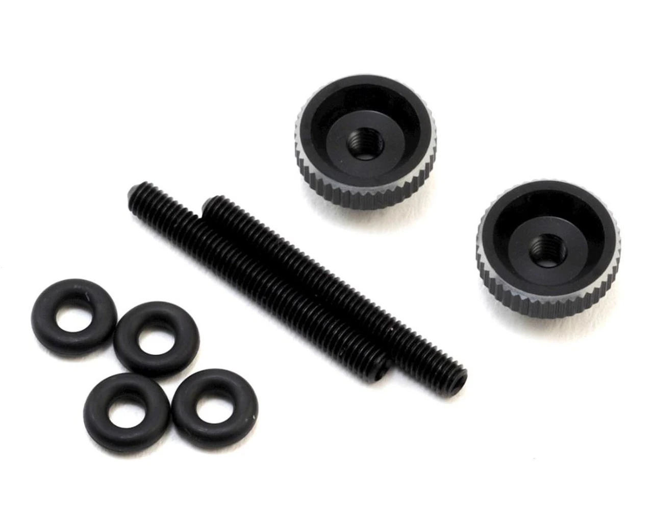 Yokomo YZ-2 Light Weight Battery Post Nuts. Package includes two battery strap hold down nuts, two set screws and four o-rings.